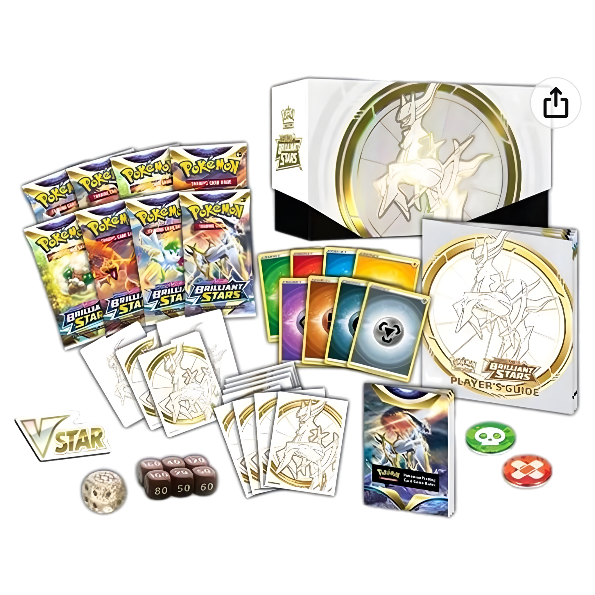 Overflowing with light, Arceus VSTAR descends from on high to share its celestial powers with other Pokémon V. Shaymin VSTAR, Charizard VSTAR, and Whimsicott VSTAR find themselves wielding awesome new VSTAR Powers, while Mimikyu VMAX, Aggron VMAX, and Kingler VMAX in its Gigantamax form boast tremendous strengths of their own. Discover glimmering constellations and start your journey toward stellar greatness in the Pokémon TCG: Sword & Shield—Brilliant Starsexpansion!